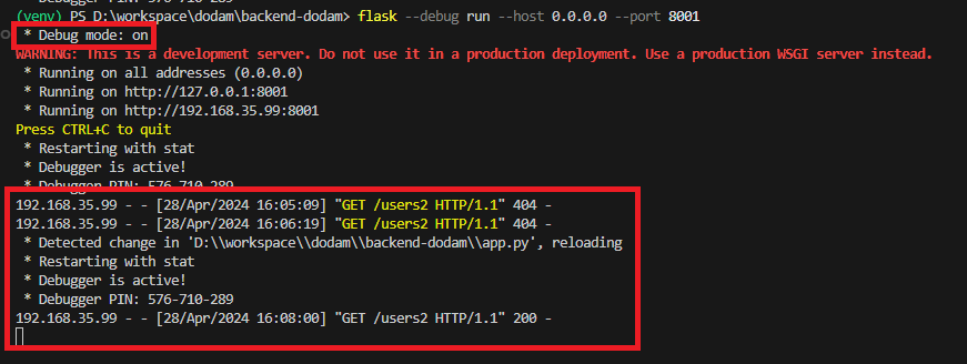 맨 처음에 404에러가 떨어지는 로그를 확인하고 제가 app.py를 수정하고 다시 재로드 된 로그와 그 다음에 다시 users2를 호출하였을 때 정상적으로 200 응답을 주는 것을 확인하실 수 있습니다 !