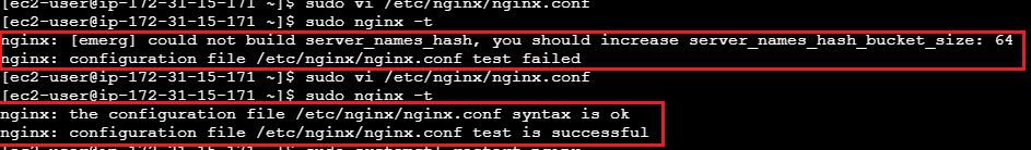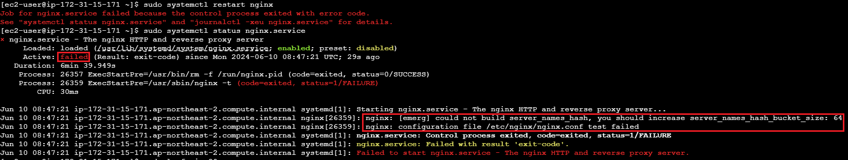 nginx 상태를 보니 failed로 뜨고 아래에 실패 로그를 보니 could not build server_names_hash, you should increase server_names_hash_bucket_size: 64 오류가 떠서 nginx 상태가 failed로 뜬걸 확인하실 수 있습니다.