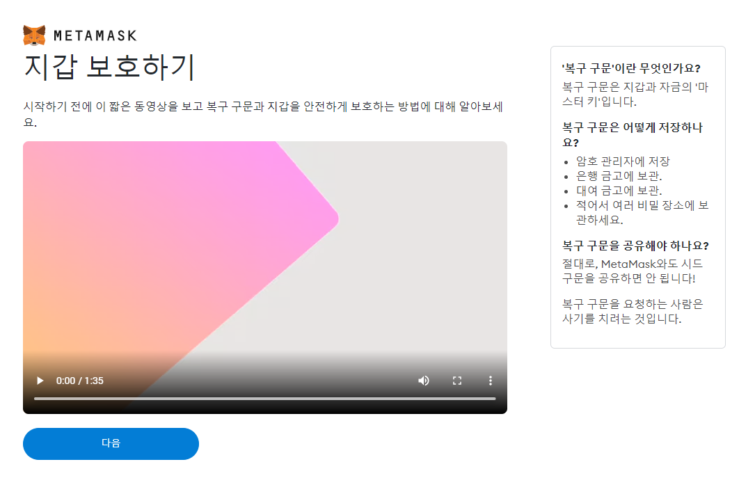 4. 지갑을 보호하는 영상을 보여 주며 보안 방법 & 복구 방법에 대해 알려줍니다.