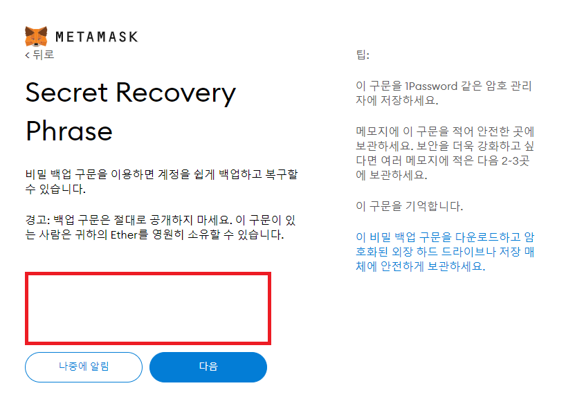 5. 빨간 네모 박스에 있는 시드 구문들을 순서대로 기억 & 보관을 하고 있어야합니다.