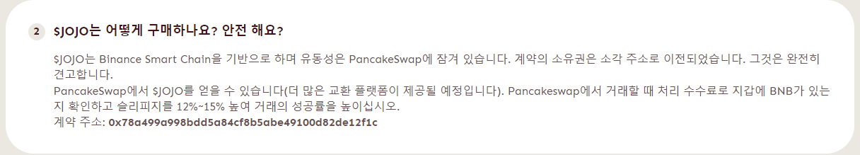 ※ 조조(JOJO) 코인의 계약 주소 : 0x78a499a998bdd5a84cf8b5abe49100d82de12f1c