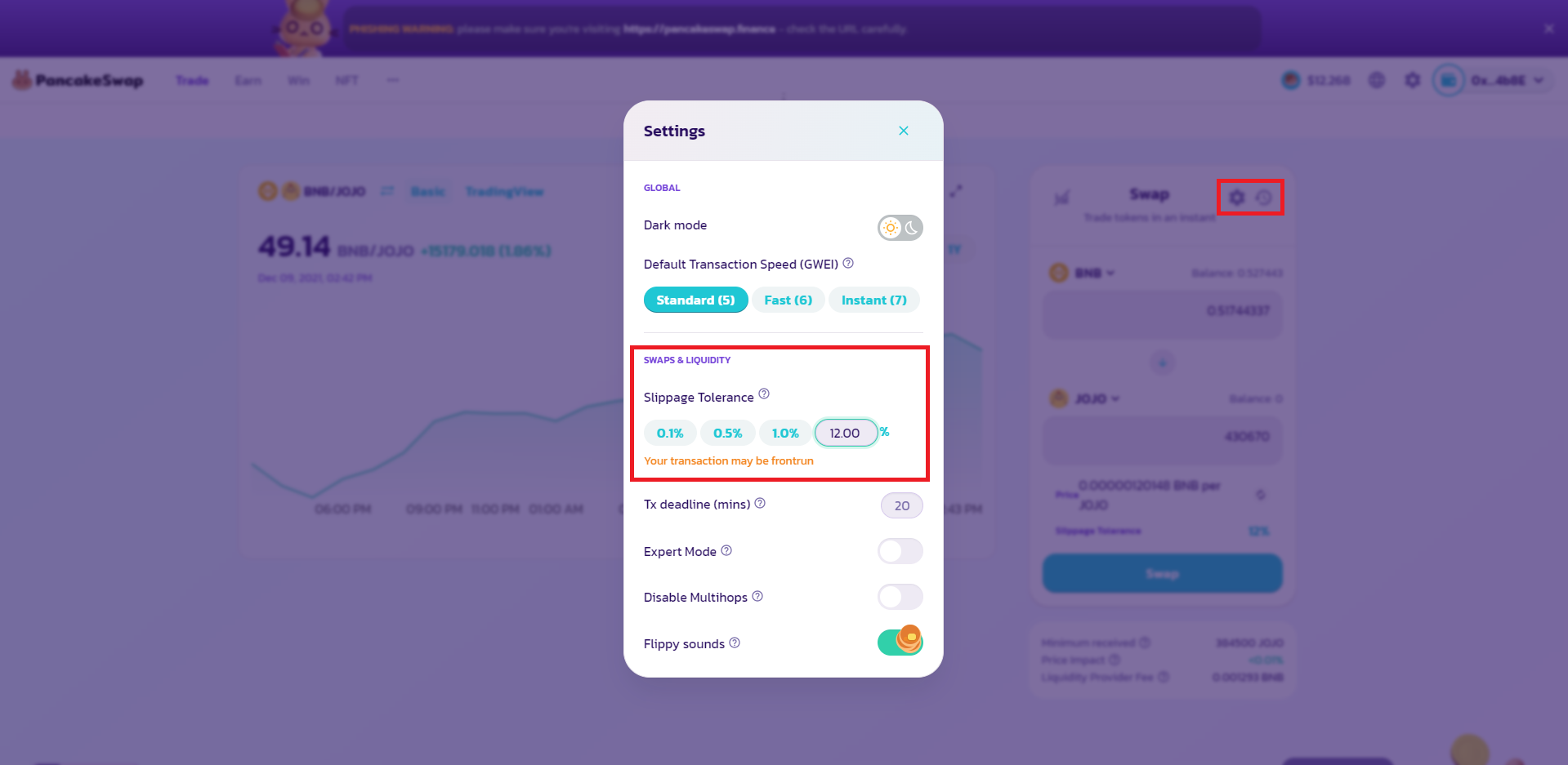 5-6. 조조 코인은 슬리피지(수수료)를 12퍼센트로 측정해야 스왑이 가능하게 됩니다. 아래 그림과 같이 Swap 옆에 있는 톱니바퀴를 선택하게 되면 Settings창이 뜨게됩니다. 중간에 있는 슬리피지를 12.00%로 설정을 해주시고 창을 닫으시면 됩니다.