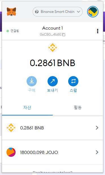 7. 스왑을 진행하게 되면 지갑에 BNB코인을 차감되고 JOJO코인이 증감되는것을 확인 할 수 있습니다.