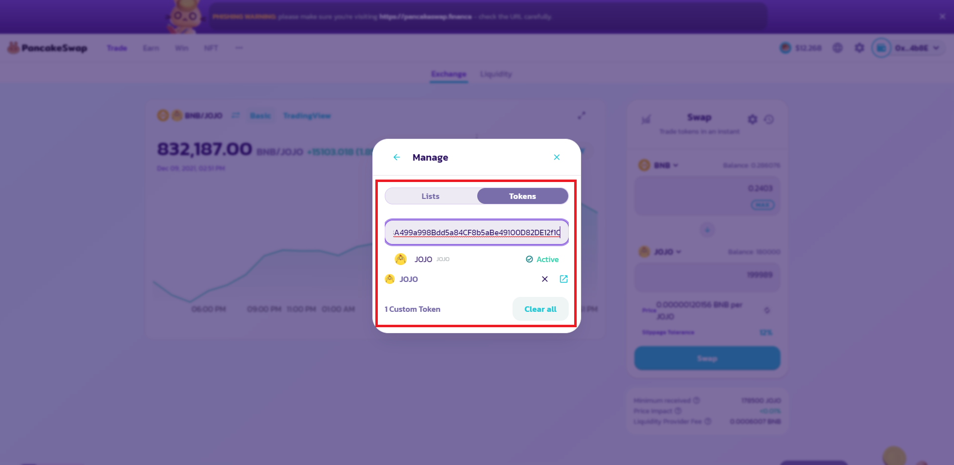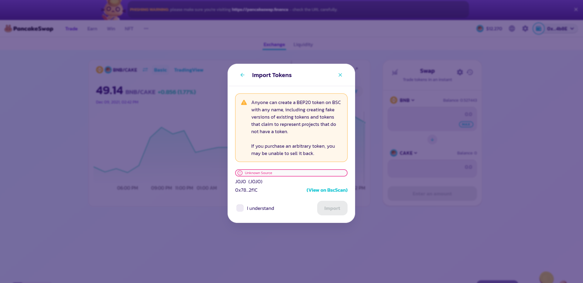 5-4. 주소가 맞는지 체크하고 임포트 할 것인지 물어봅니다. 이해했습니다에 체크하고 Import를 진행하게 되면 조조(JOJO) 코인으로 스왑이 가능하게 됩니다.
