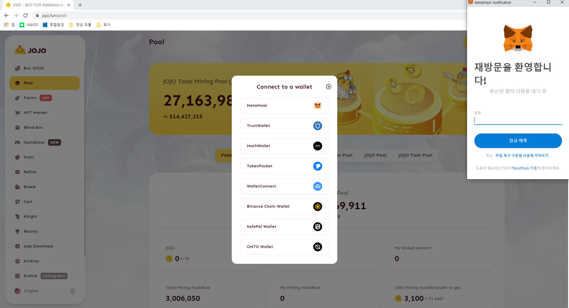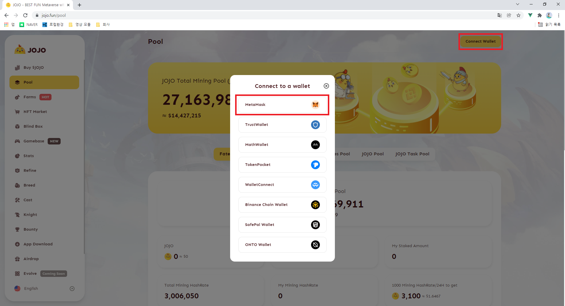 3. 아래와 같은 Pool 화면으로 들어오게 됩니다. 상단 오른쪽에 Connect Wallet(지갑 연결)을 클릭하고 MetaMask(메타마스크)를 클릭하여 지갑 패스워드를 치게 되면 지갑이 연결됩니다!