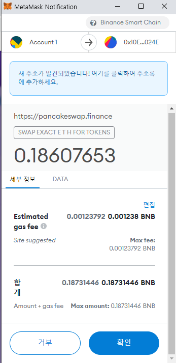 - 0.1BNB 정도의 가스비는 지갑에 그대로 두고 원하는 만큼의 BNB코인을 JOJO코인으로 스왑하도록 하겠습니다.