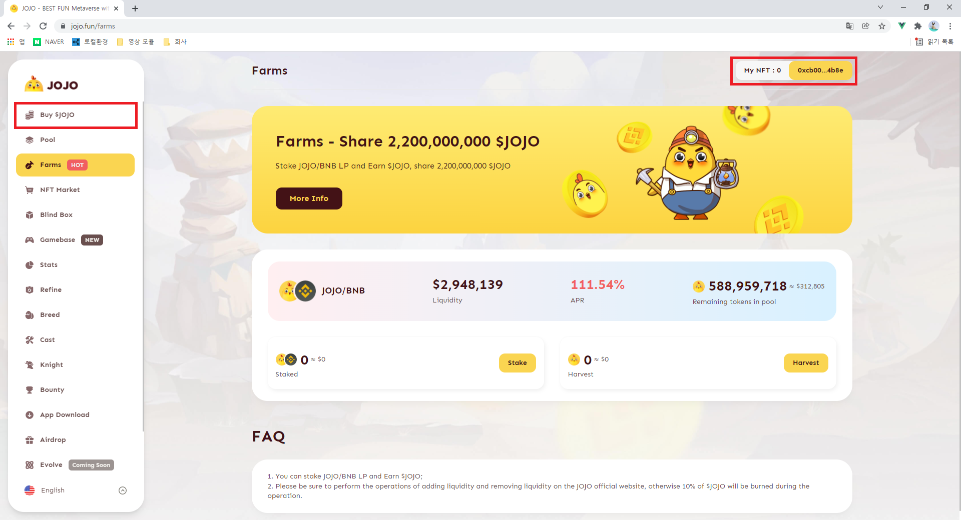 4. 아래와 같이 로그인이 정상적으로 되었으면 지갑 연결 부분이 로그인 상태로 변경이 되게 됩니다. 이 상태에서 왼쪽 메뉴란에 Buy $JOJO를 클릭!