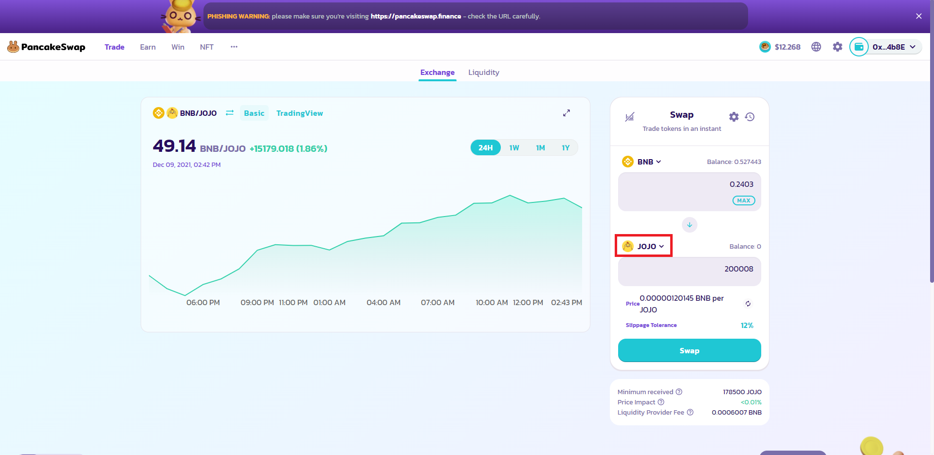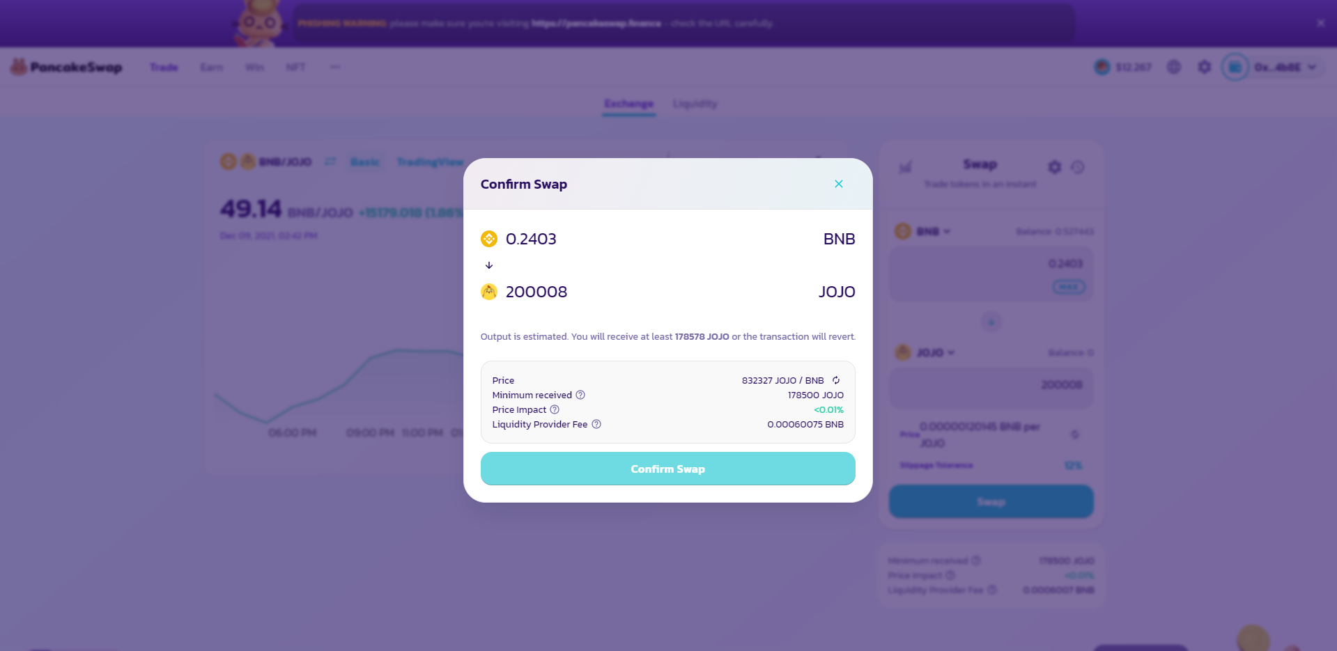 6. 자신의 지갑에 있는 BNB코인으로 JOJO로 스왑하는 과정입니다.