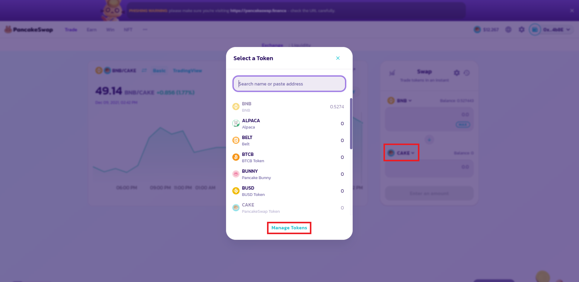 5-1. 아래의 그림처럼 홈페이지 뒷단에 있는 CAKE 부분을 클릭해주시면 Select a Token이 뜨게 됩니다.