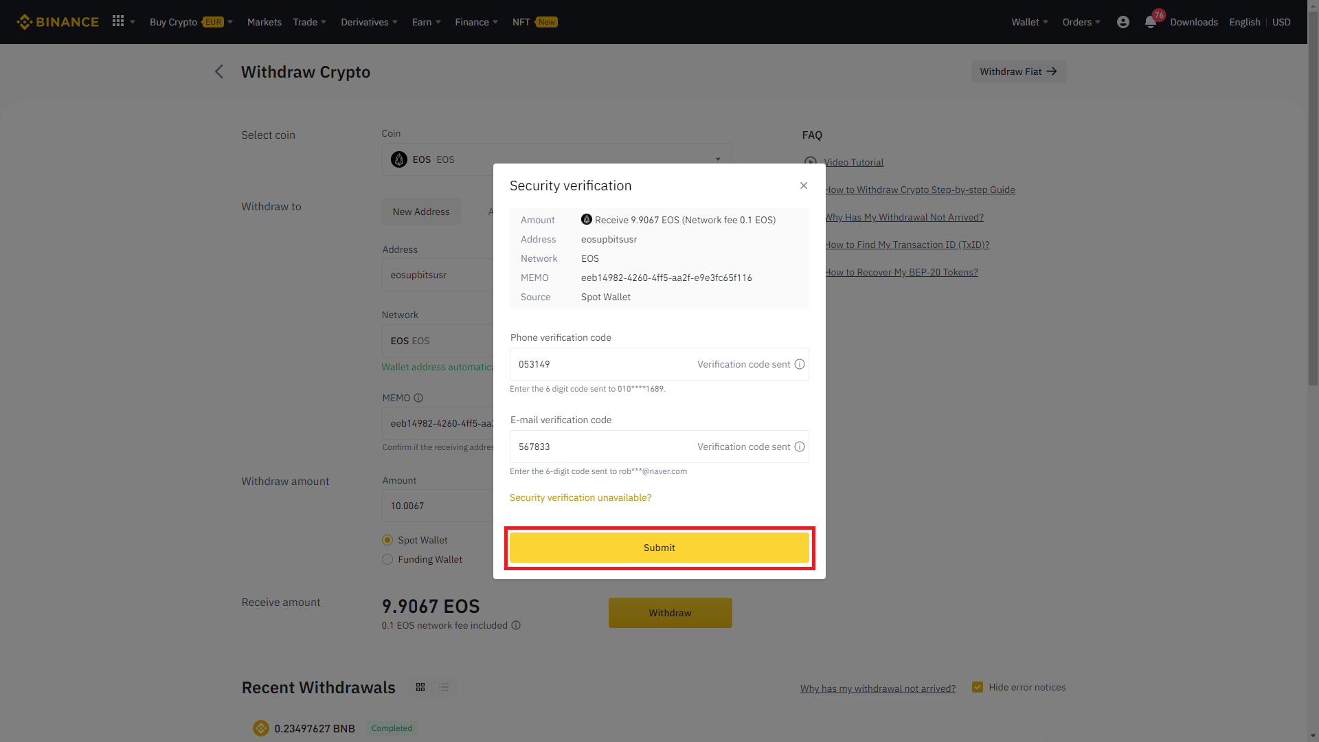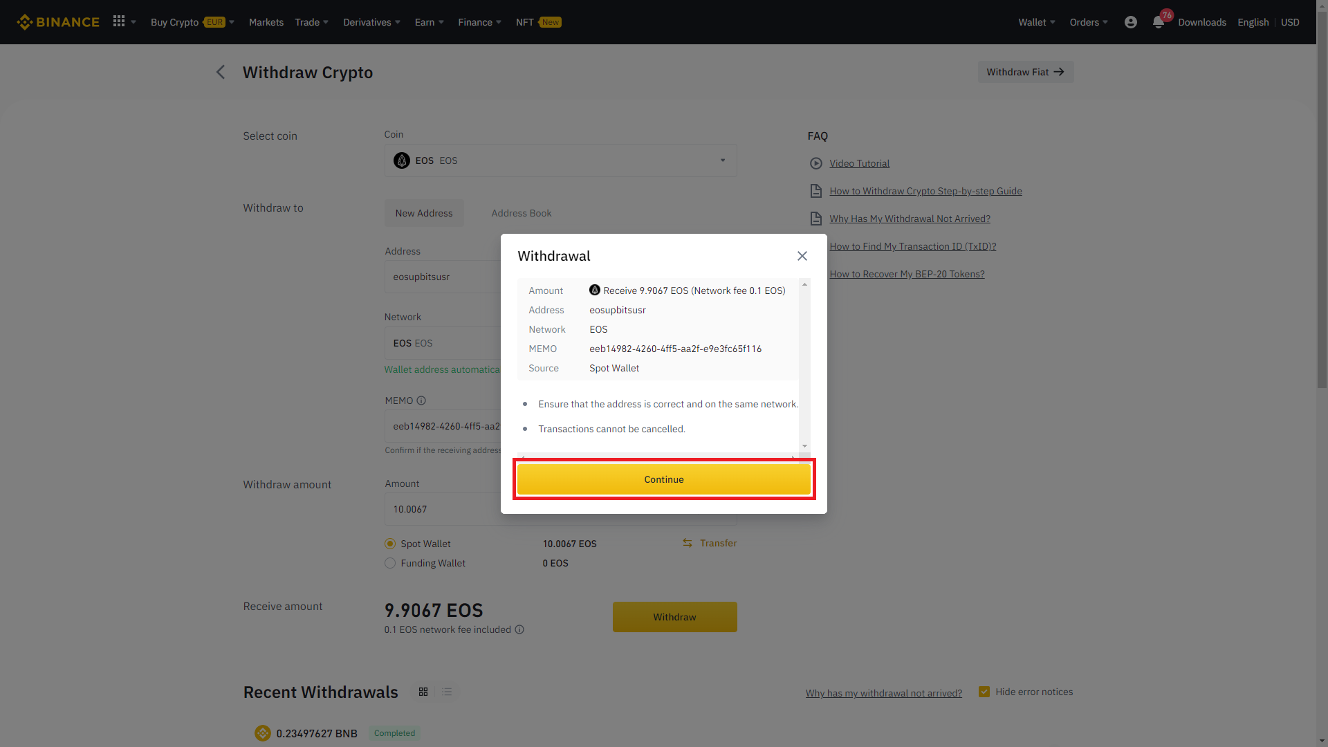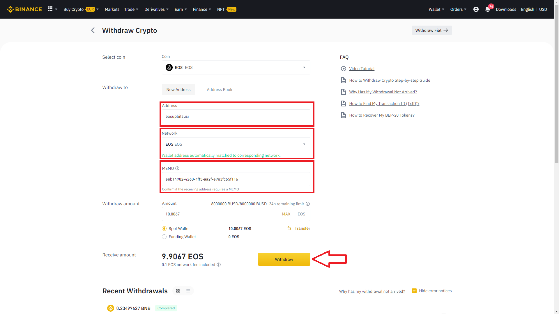 - 주소, 메모, 출금량 확인 후 Withdraw 클릭