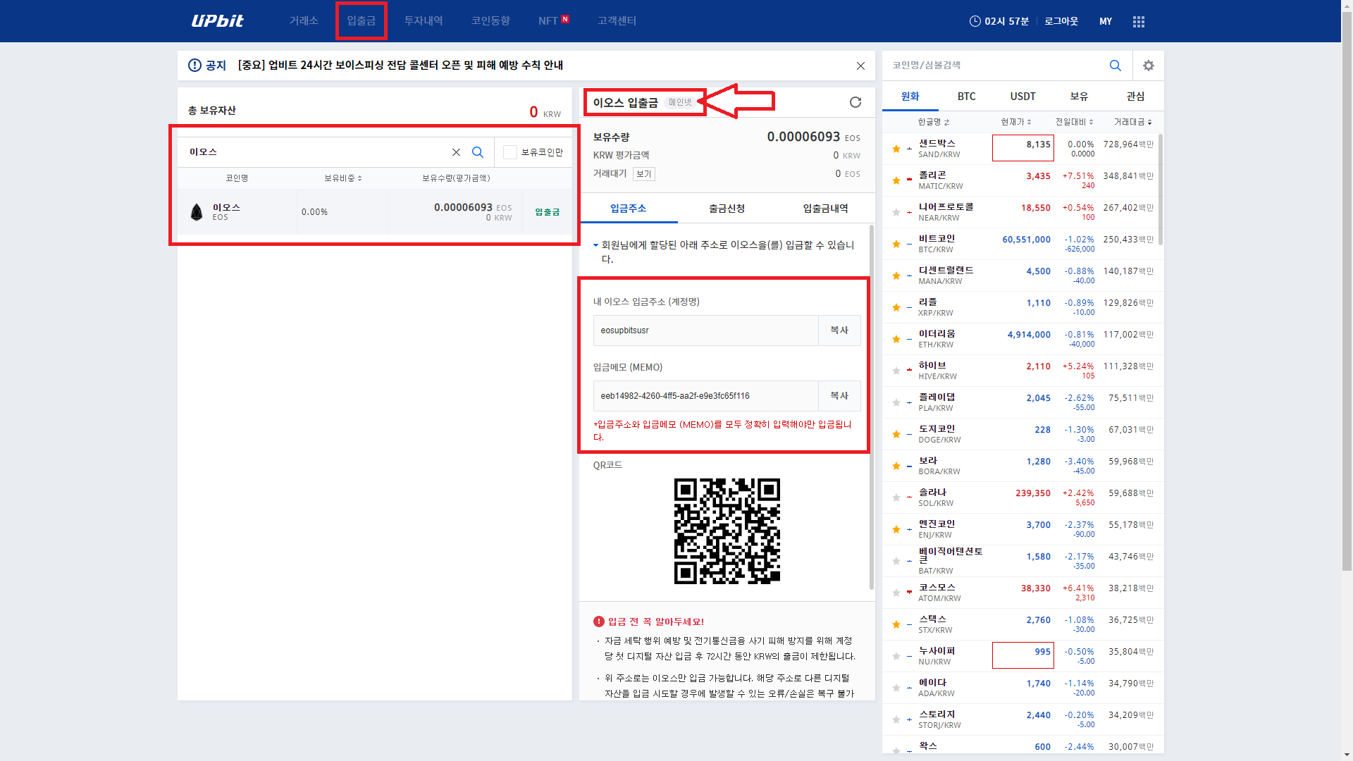 ※ 로그인 -> 입출금 -> 이오스 -> 네트워크를 꼭 확인(메인넷) -> 입금 주소 / 입금 메모 복사