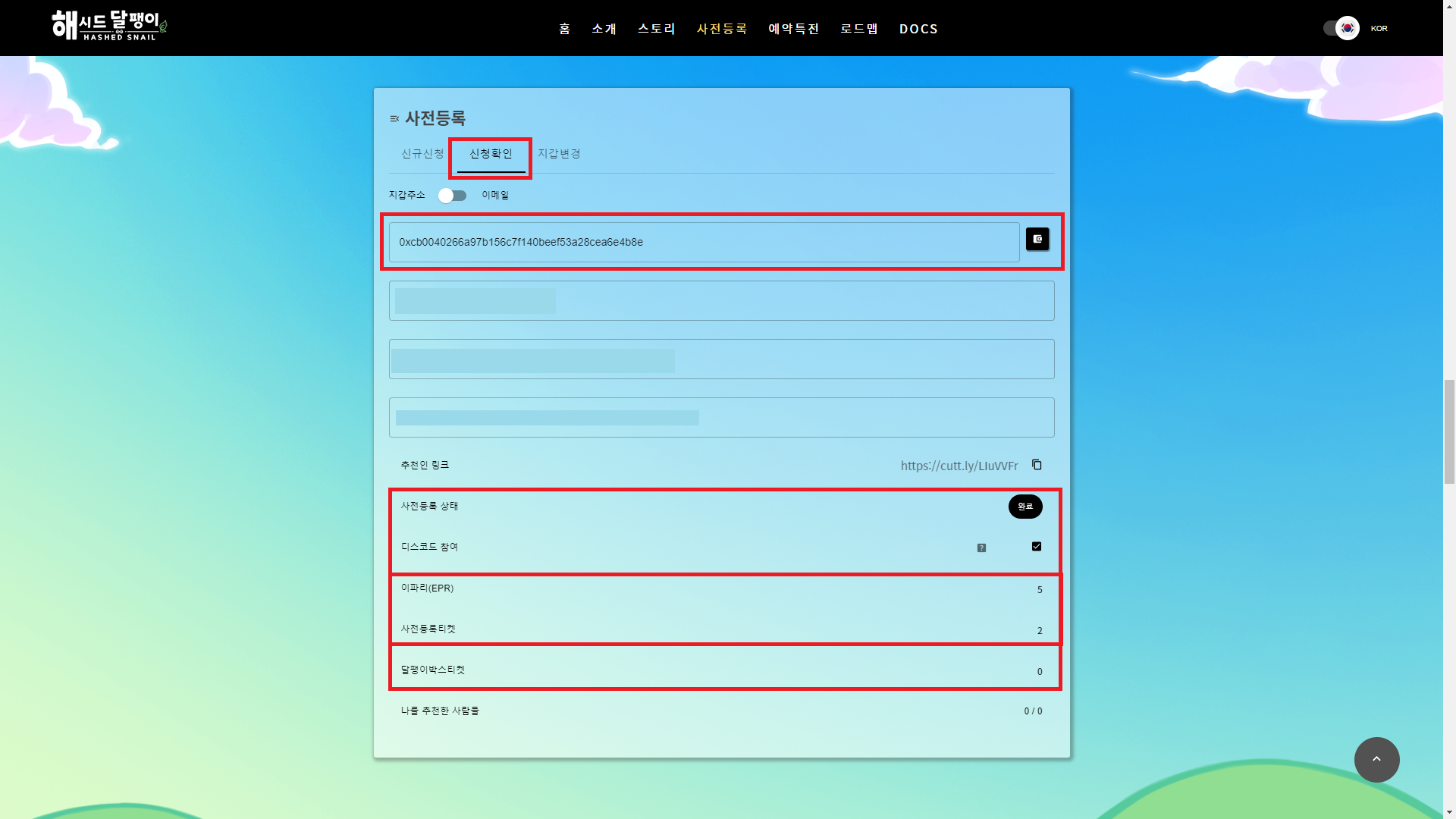- 지갑, 이메일을 입력하면 이메일 인증을 하면 홈페이지 사전 등록이 되었다고 뜨고 디스코드에 접속하여 해시드달팽이 디스코드 참여(https://discord.gg/zzDW3aPe) → 🤖-사전등록완료bot 채널로 이동 → /사전등록 명령어 입력 → 지갑주소 입력 하시면 사전등록이 완료되고 특전이 자동 지급됩니다.