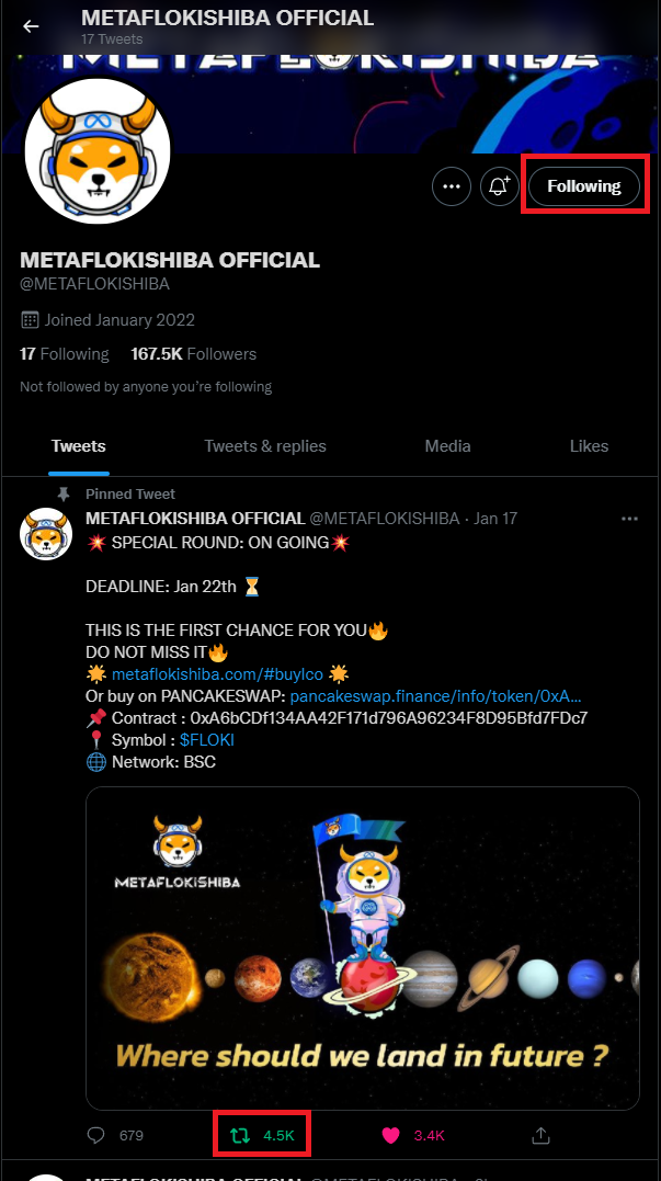 3-2. 메타플로키시바 트위터 팔로우 및 고정글 리트윗(아래 사진에서 맨 밑에 빨간 박스를 클릭)