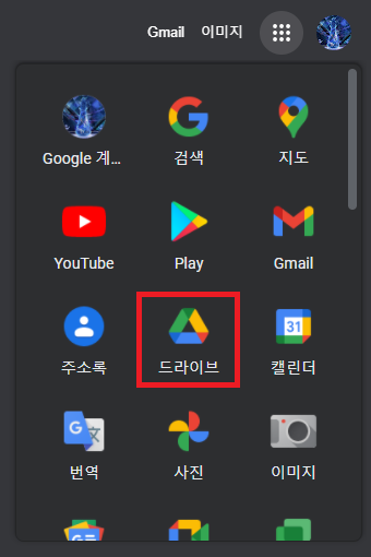 1. 크롬에 접속하여 오른쪽 상단에 메뉴(점9개)를 클릭하여 나오는 구글 드라이브를 클릭