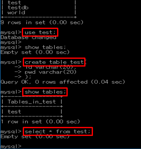 7. insert into 테이블이름(id, pwd) values(test, 1234);