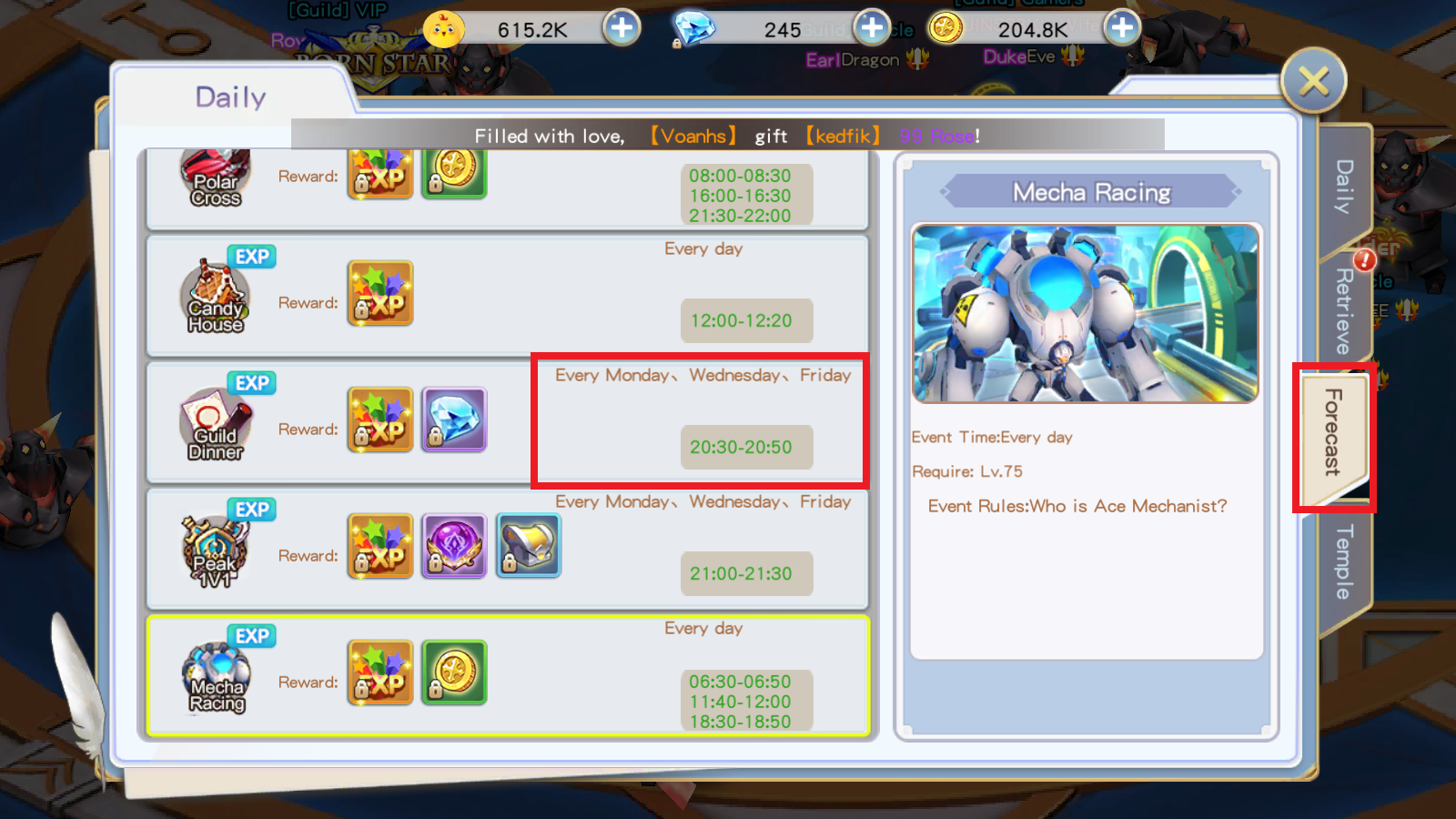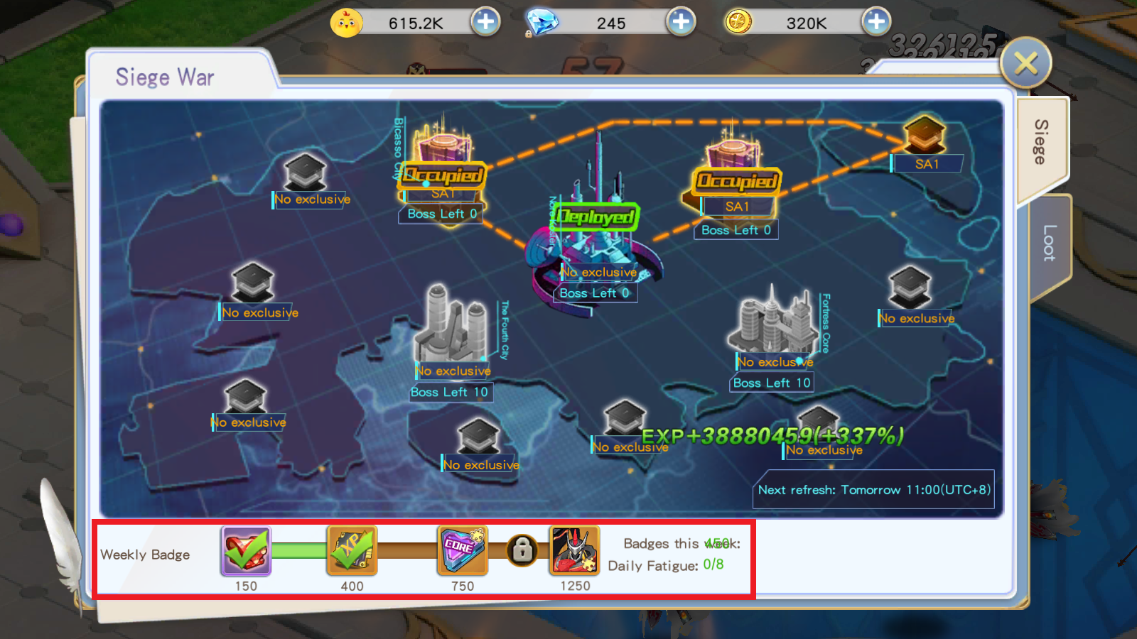 ※ 한 주 보상 리스트 : 보라색 메카 기어, 메카 업그레이드 재료 (3000EXP), 메카 Core Gear 조각, Axe of Destruction 조각
