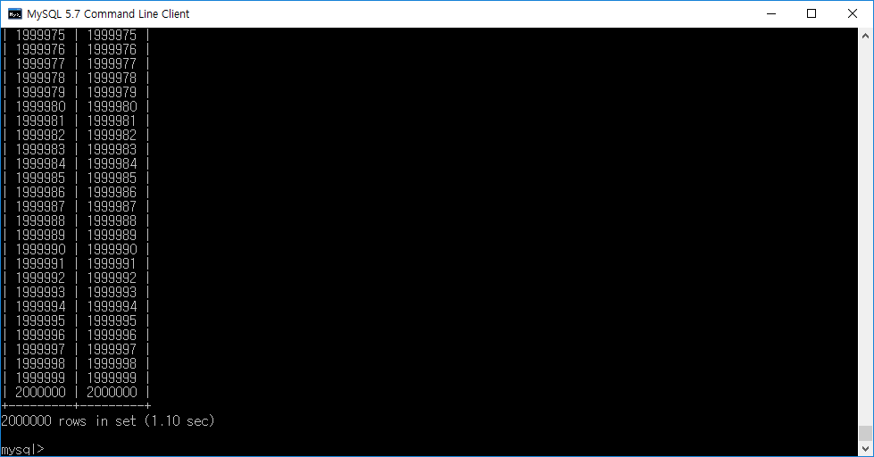 // 전체적으로 해석해보면 nowtime테이블에(id, num)에 해당하는 컬럼에 (i, i)라는 값으로 넣겠다라는 함수인데 i가 1부터 2,000,000이므로 1~2,000,000이라는 값이 들어가게 됩니다.