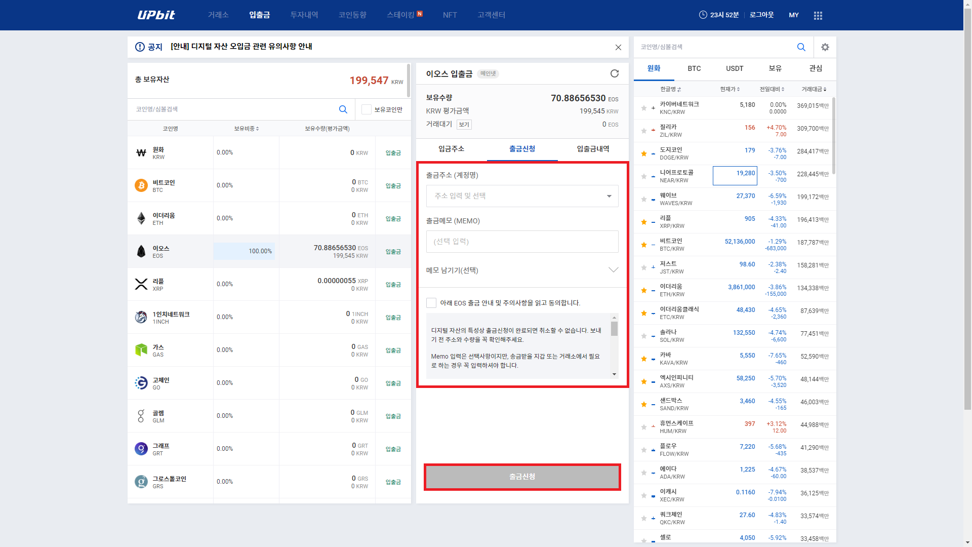 2. 출금할 코인(EOS)에 있는 입출금을 클릭
