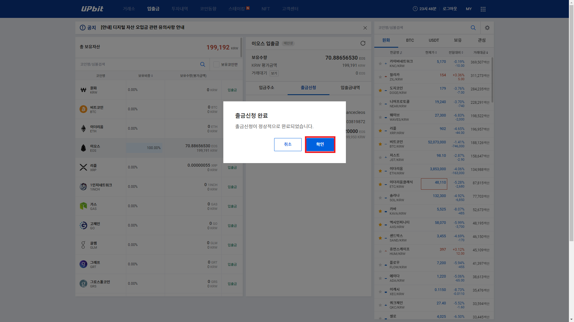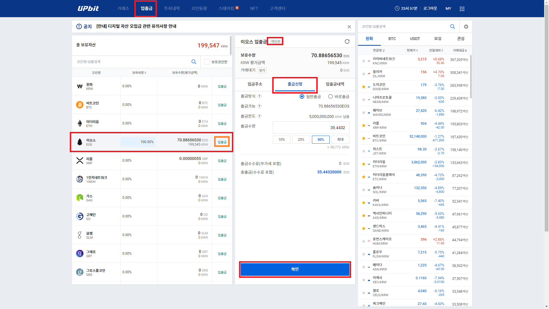 4. 출금 수량 입력하여 하단에 확인을 클릭