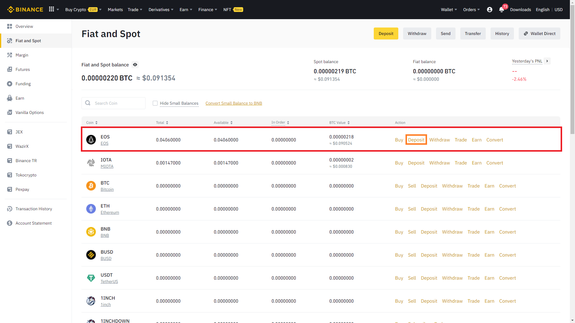 3. 입금을 원하는 코인 라인에 있는 Deposit를 클릭