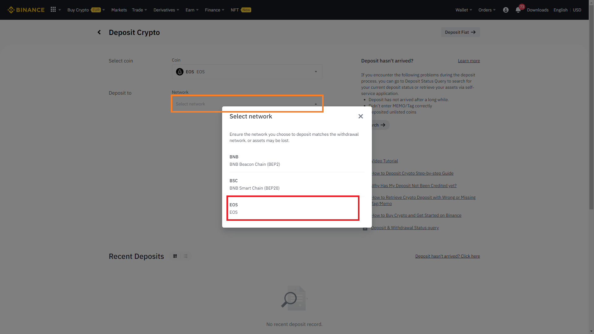 4. 입금 받을 코인의 네트워크 선택 (업비트에서의 메인넷이 바이낸스에서의 EOS 네트워크 입니다.)