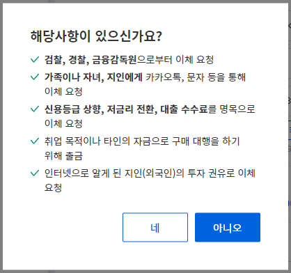 3. 출금 확인 문구 "아니요"를 클릭